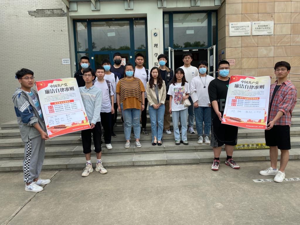 物理学生第二党支部印制了《中国共产党廉洁自律准则》中“党员廉洁自律规范”相关内容的宣传海报,集体诵读“党员廉洁自律规范”相关内容,支部全体成员在宣传海报上郑重承诺签名。