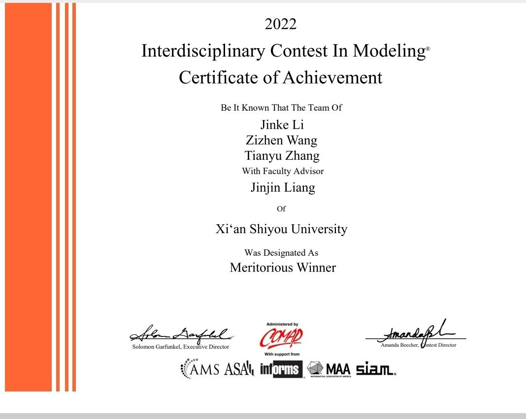 教师梁锦锦的指导下,不负众望,以优异的表现喜获一等奖(M奖,Meritorious Winner)。