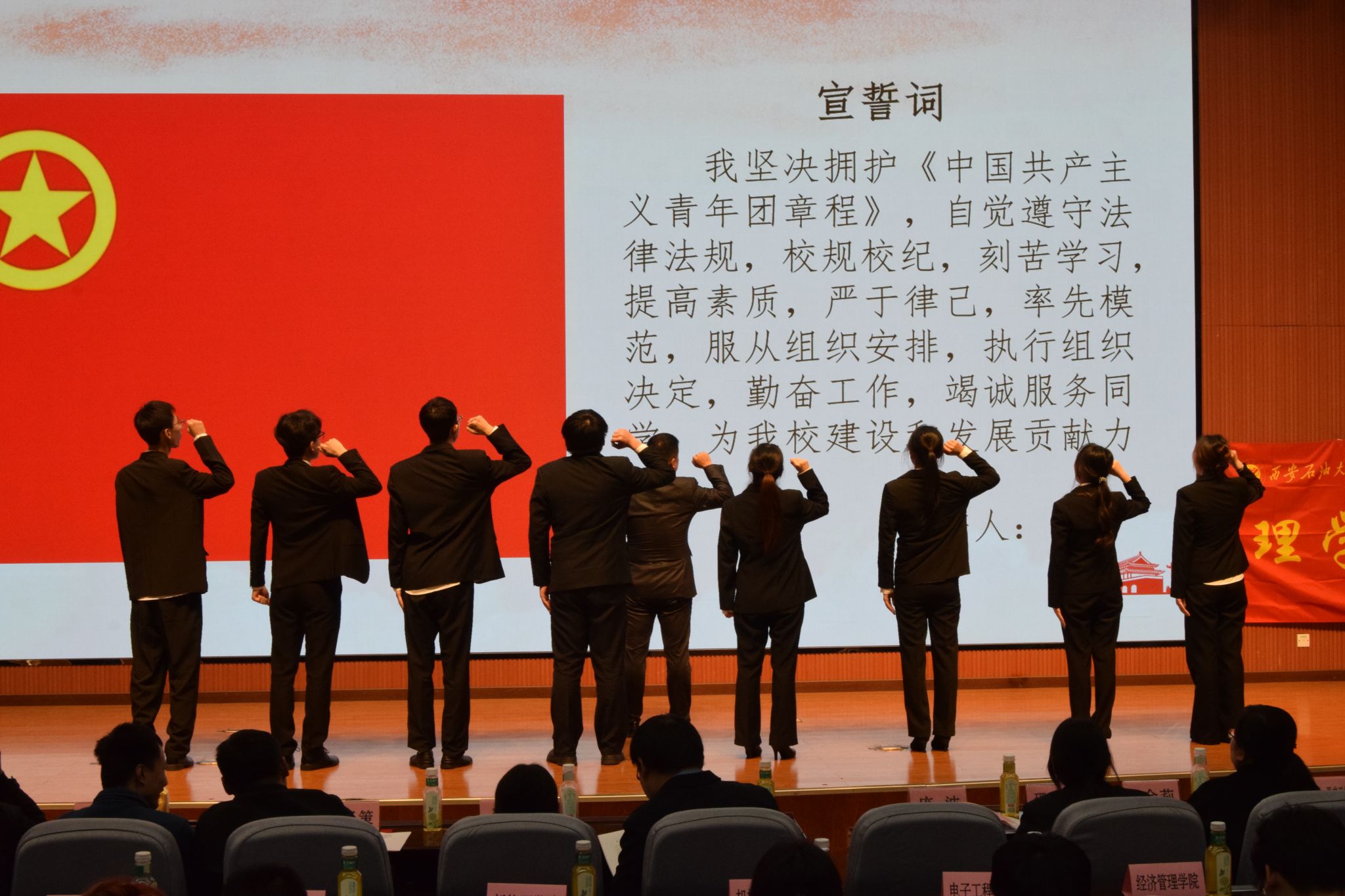 团委书记庞波带领新当选的委员面向国旗庄严宣誓就职。