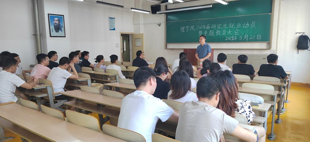 2024届研究生就业工作,折延宏副院长分三个方面作就业动员。一是希望研究生同学早思考、早准备,将就业与考博作为下一阶段最重要工作;二是希望研究生同学立足所学专业,将目光放长远,到基层去、到祖国需要的地方建功立业;三是希望研究生同学关注本年度暑期社会实践、企业就业实习,为成功求职打下坚实基础。最后,折老师结合暑假实验室安全、“端午”小长假,为大家作了安全教育和提示。
