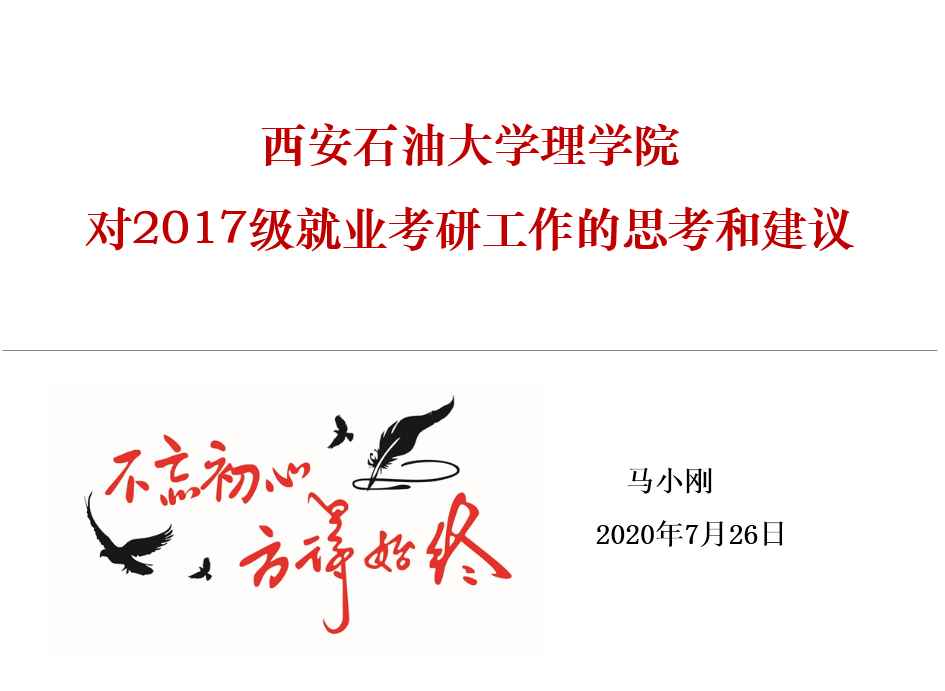 党委副书记马小刚、学生管理办公室主任丁亦喆、辅导员康伟一行三人到鄠邑校区看望慰问暑期留校考研的81名学子,马小刚书记为全体留校同学作“不忘初心、方得始终——对2017级学生就业考研工作的思考和建议”专题讲座。