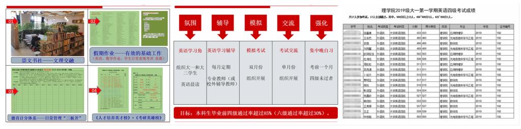 从氛围、辅导、模拟、交流、强化五个板块入手,加大四六级考试辅导力度,2019级本科生符合报考四级条件的17名同学一次性全部通过四级考试,其中500分以上13人,占比76.47%。