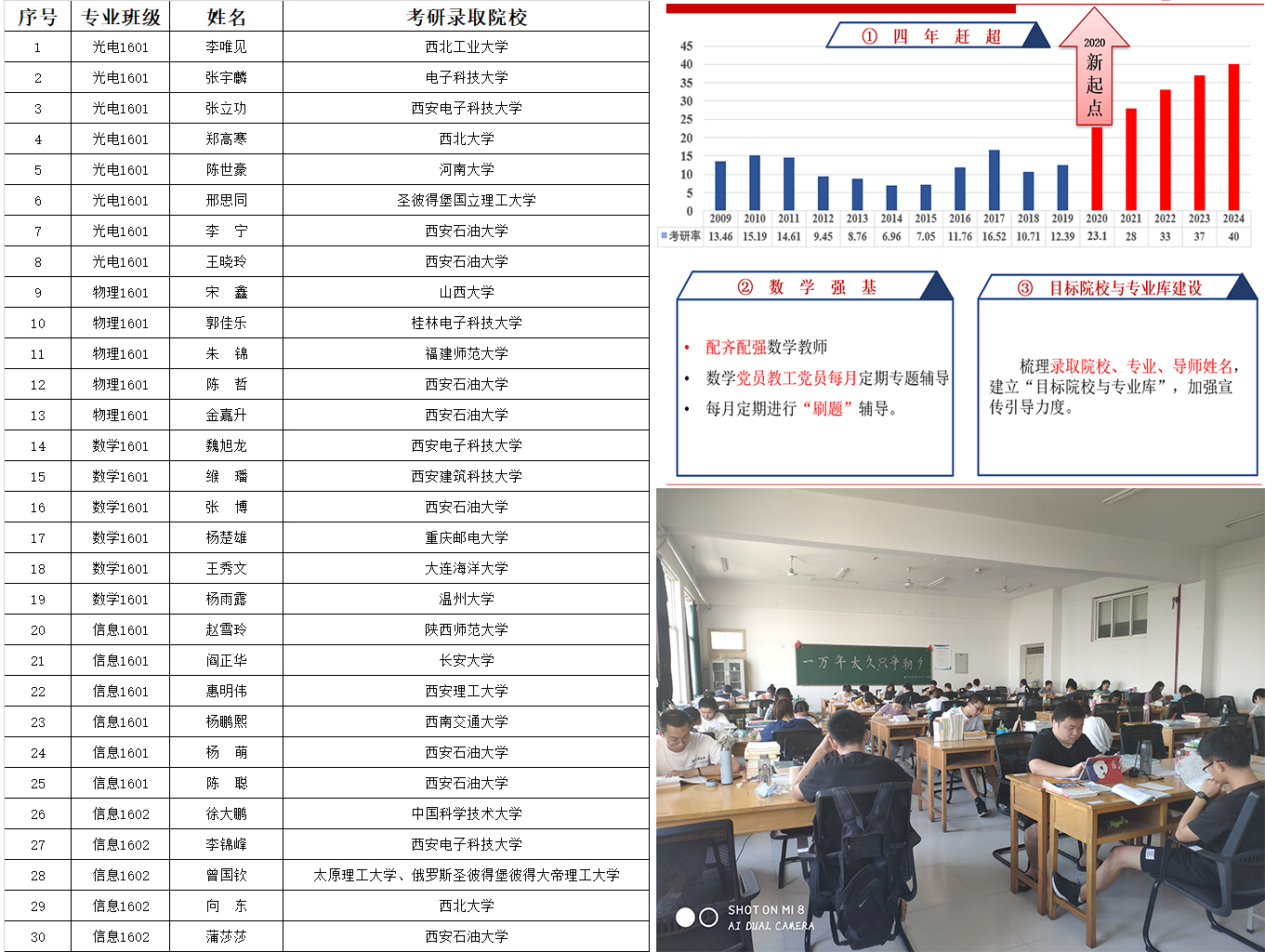 德育计分体系》,加强和规范对学生的教育管理。每年定期编撰《人才培养英才榜》,梳理本届人才培养工作。同时,编撰《考研英雄榜》,加大宣传引导力度。学管办坚持给学生布置假期作业,加强数学和英语的学习指导,组织学习经验交流会多场。斗牛游戏