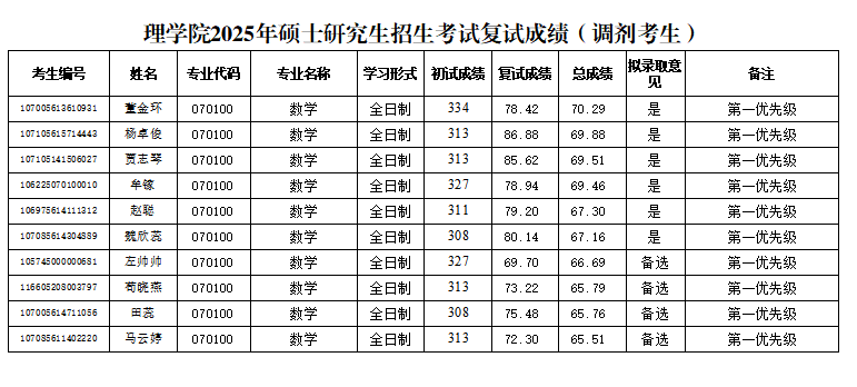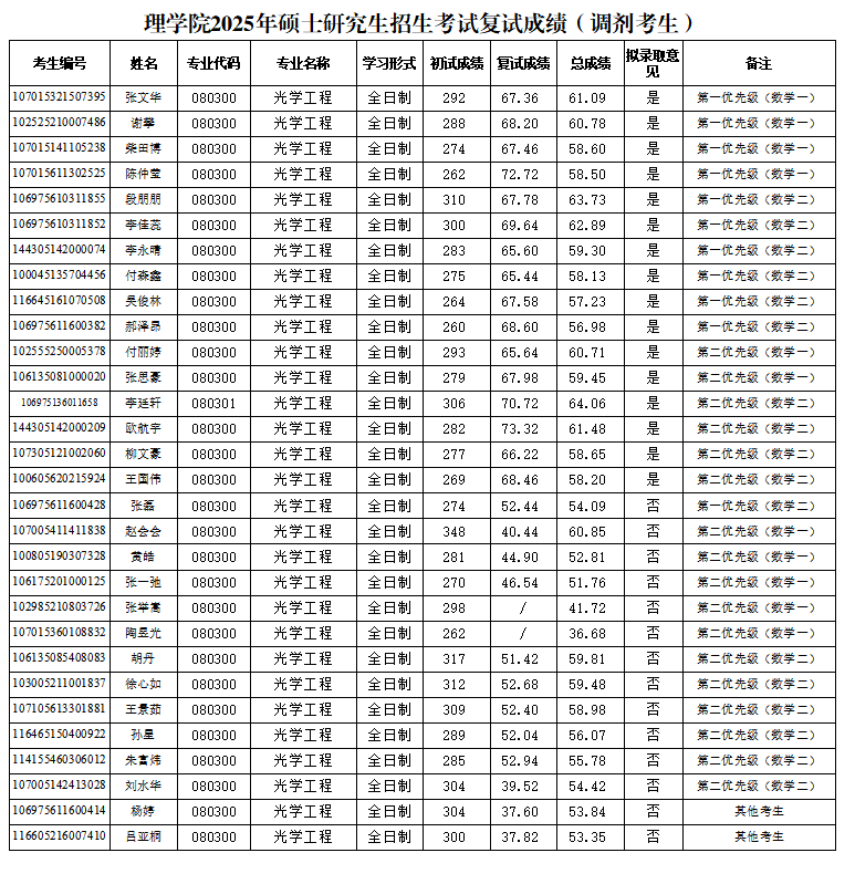 年硕士研究生招生复试成绩(数学、光学工程调剂考生)(第一批)予以公布,如有异议,请联系(