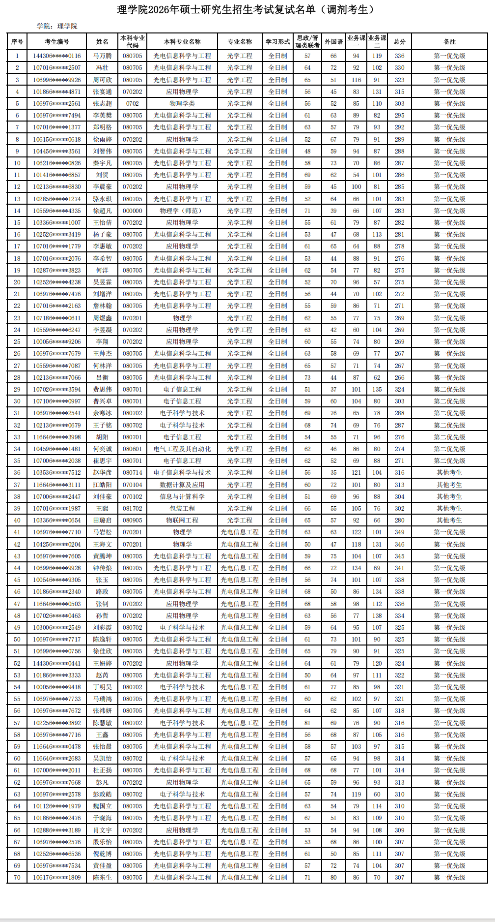 调剂复试名单予以公布第一批(光学工程、光电信息工程)。