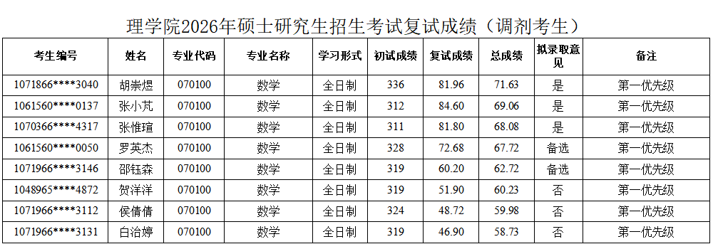 根据教育部及陕西省教育考试院相关文件精神和要求,现将斗牛游戏 2026年硕士研究生招生复试成绩第一批(数学)予以公布,如有异议,请联系(029)88382735进行反馈。